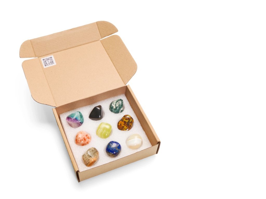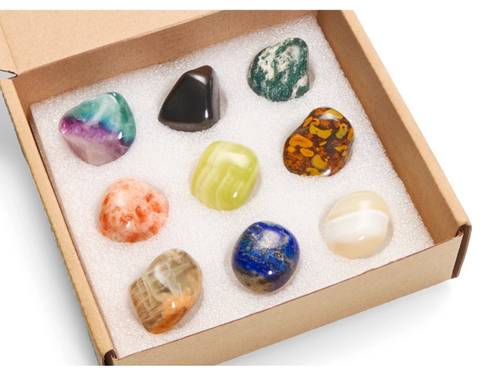 A készlet az alábbi népszerű ásványokat tartalmazza: fluorit, sungit, faachát, napkő, aragonit, Ajooba jáspis, holdkő, lazurit és fehér achát.