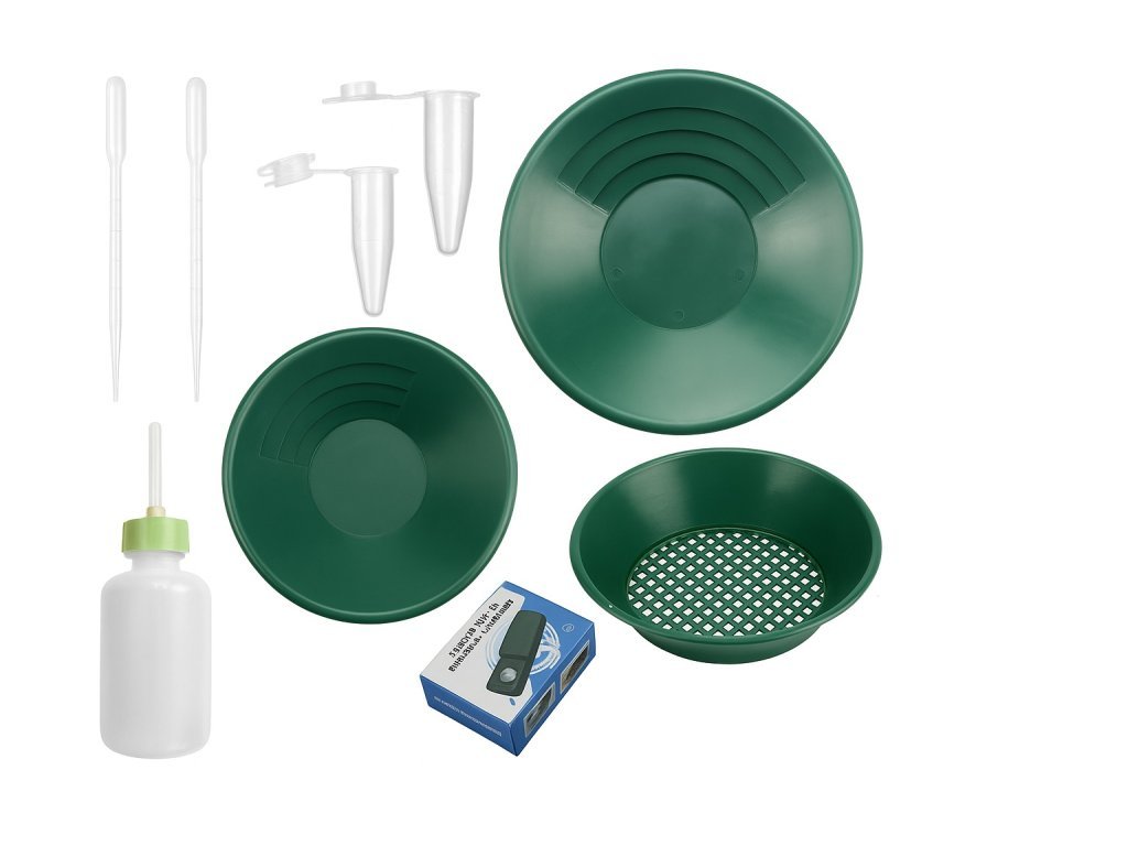 Komplex eszközkészlet: szita, pipetták és egyéb kiegészítők a teljes aranymosási folyamathoz.