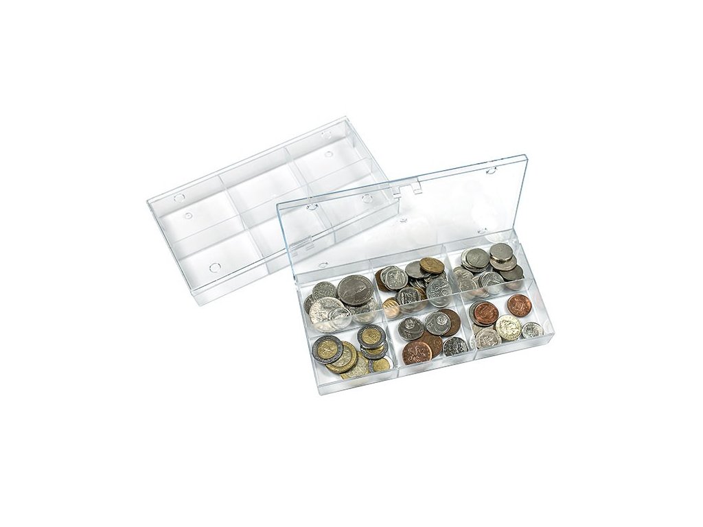 Apró kincsei rendszerezéséhez kínáljuk ezt az átlátszó dobozt 6 téglalap alakú rekesszel. A doboz ideális érmék, ásványok, gyöngyök és más kisebb méretű tárgyak tárolására. Több ilyen doboz könnyen egymásra helyezhető, így kiválóan alkalmas értékei szállítására is, például börzékre vagy kiállításokra. Mérete kompatibilis 12 rekeszes gyűjtődobozunkkal, így a két típus jól kombinálható és egymásra rakható.