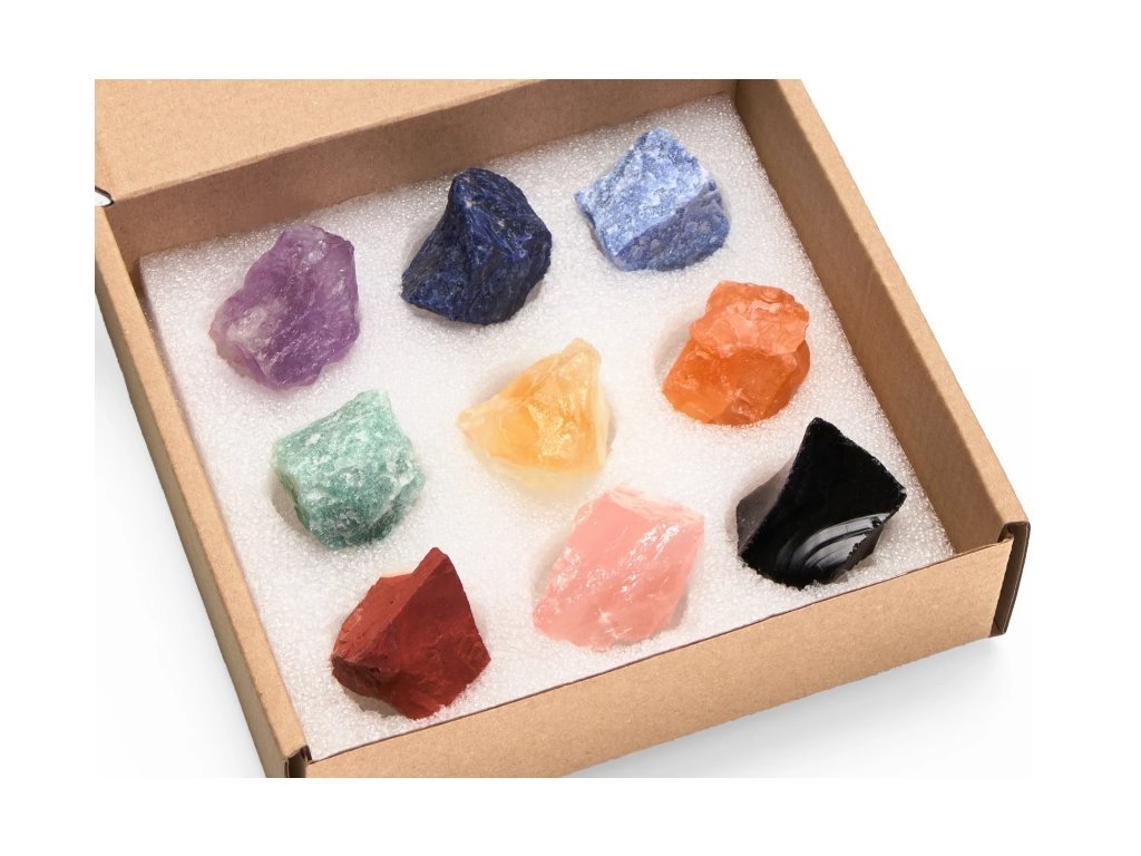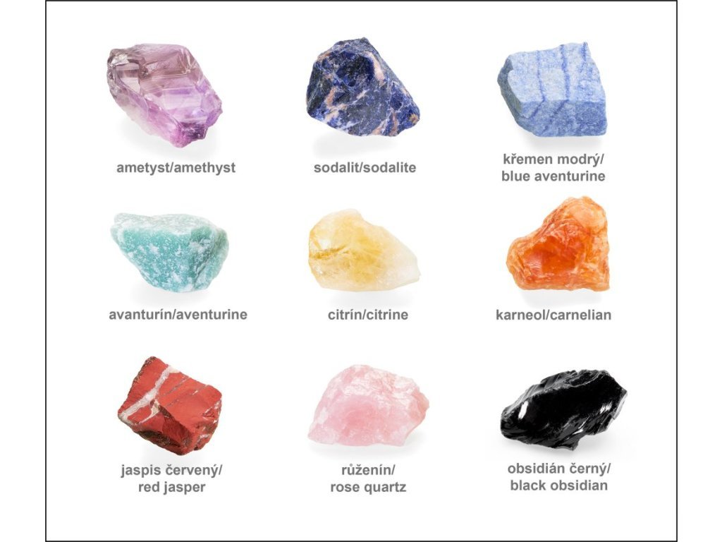 A készlet a következő népszerű kőfajtákat tartalmazza: ametiszt, szodalit, kék kvarc, aventurin, citrin, karneol, vörös jáspis, rózsakvarc és fekete obszidián.